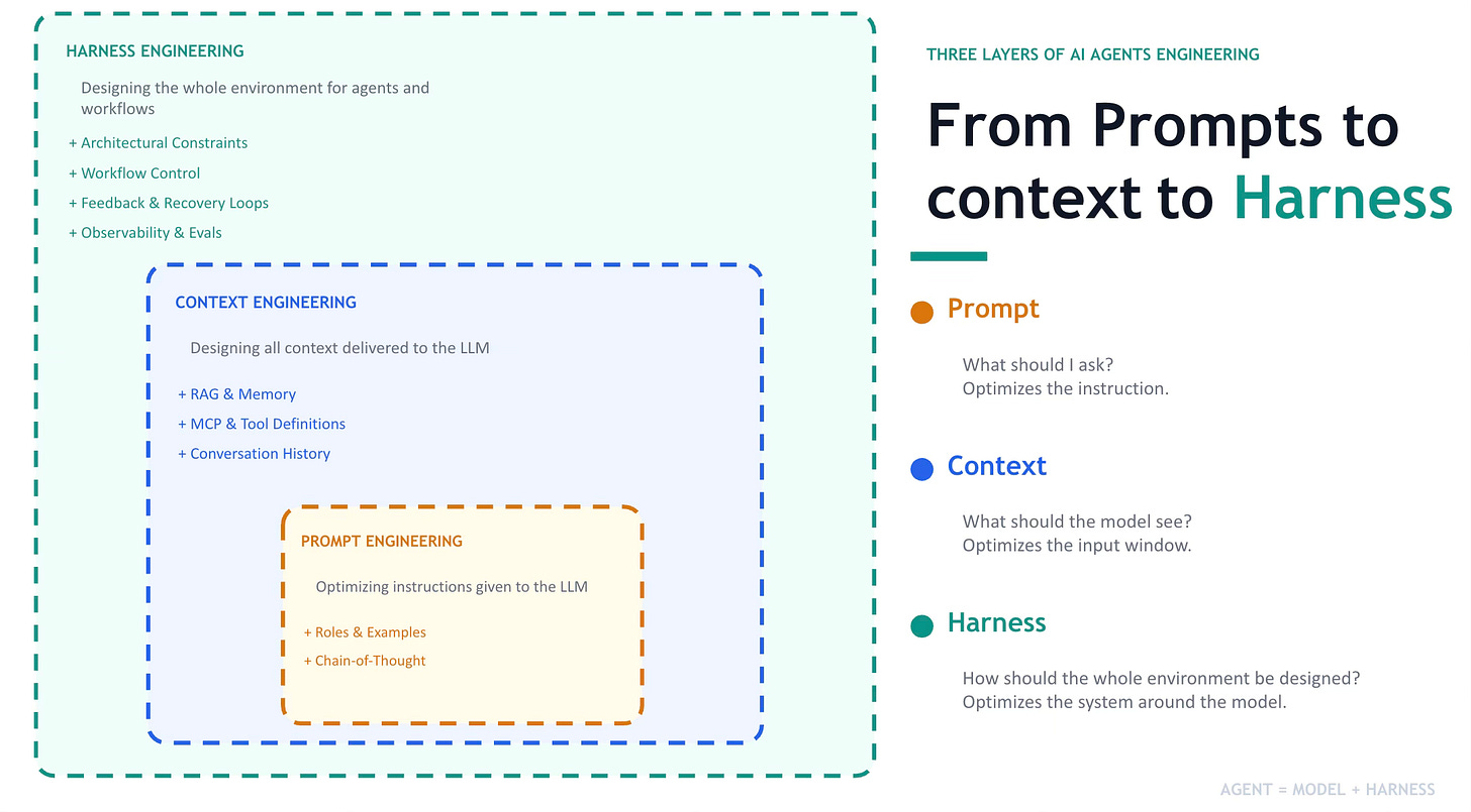 Each layer solves a different class of problem. As agents take on more autonomous, long-horizon work, the harness layer matters more than the other two combined.